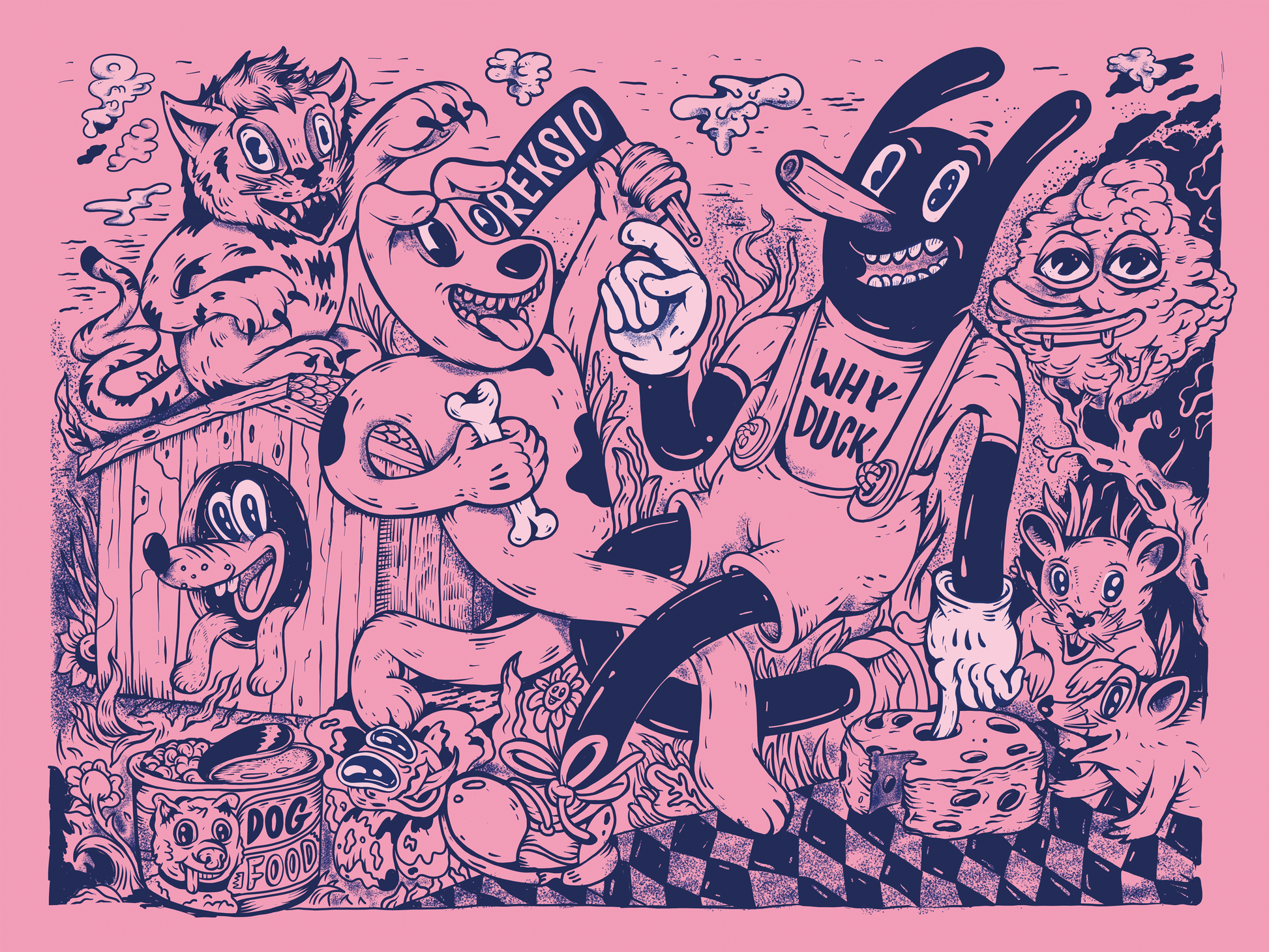 Na plakacie spotykają się dwa światy: klasyczny Reksio, symbol dziecięcej niewinności i nostalgii, oraz Łajdak – autorska, groteskowa postać WhyDucka. Z kołkiem zamiast nosa i zadziornym uśmiechem wprowadza do sceny bunt, chaos i subwersję.